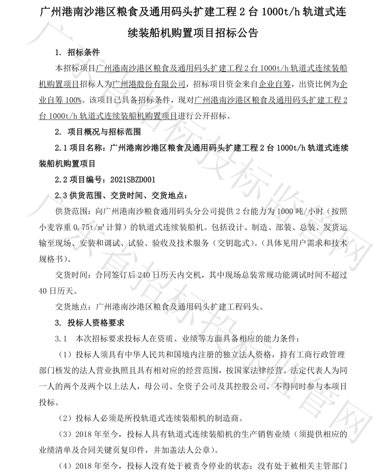 南沙港务2台1000T/H轨道式连续装船机采购公告
