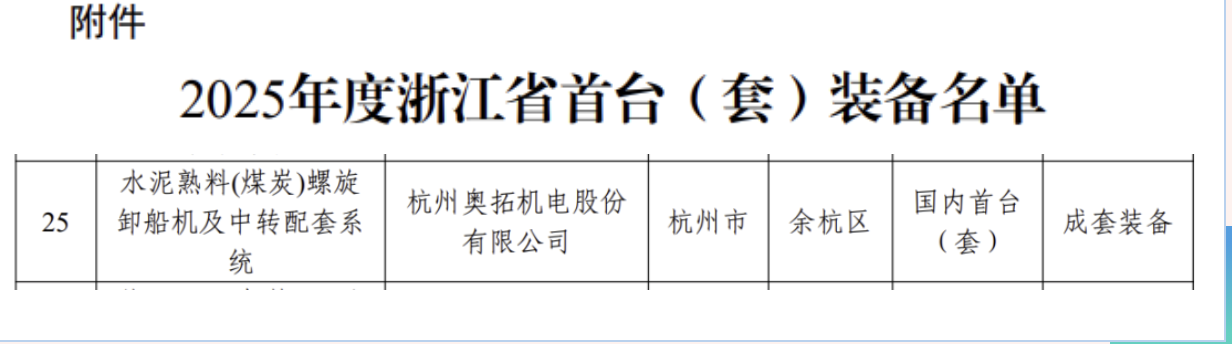 近日,杭州奥拓机电股份有限公司(以下简称“奥拓股份”)自主研发的“水泥熟料(煤炭)螺旋卸船机及中转配套系统”,成功获评国内首台(套)装备认定。该装备属于国家重点支持的高端装备产业领域,是港口物流中补短板、填空白的装备产品,通过浙江省机械工业联合会组织成果鉴定,鉴定委员会一致认为:“该成果技术难度大,创新性强,技术整体处国际先进水平,同意通过鉴定”。