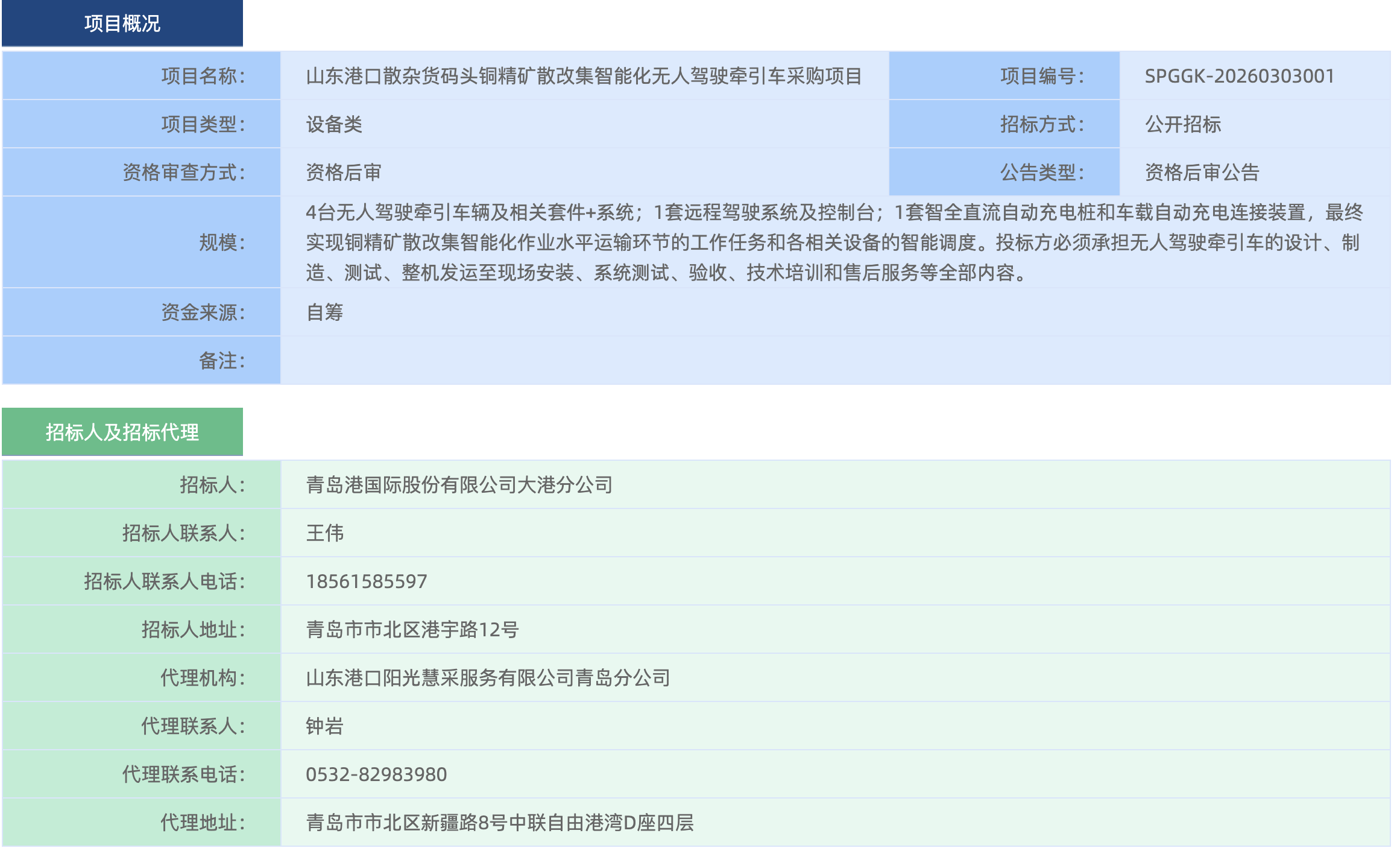 山东港口散杂货码头铜精矿散改集智能化无人驾驶牵引车采购项目招标公告