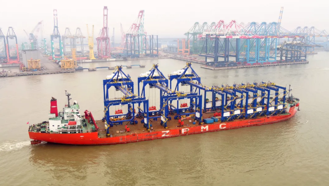 2月11日,“振华32”轮装载着海口秀英港3台轻型岸桥和8台轮胎吊从长兴分公司发运。